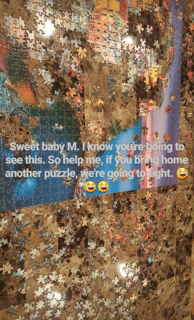 Then one weekend it finally happened. The puzzle was assembled! Well, as best it could be. There was apparently some give and take between puzzle boxes in the house, but we’ll let that slide. It was a finished product of a beautiful mountainside painting of some far away place that I’d never heard of or go to, if it even really existed. I figured it was just a painting someone created from their imagination. I also had a few words for Sweet Baby M. If you ever so much as bring home another…..