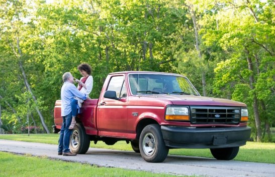 1995, red, Ford F-150, rusted everything, only one gas tank works, sometimes full of critters, 5 speed on-the-floor, duct tape on the sides, best running truck on the road. From the first time I saw her, I was in love.